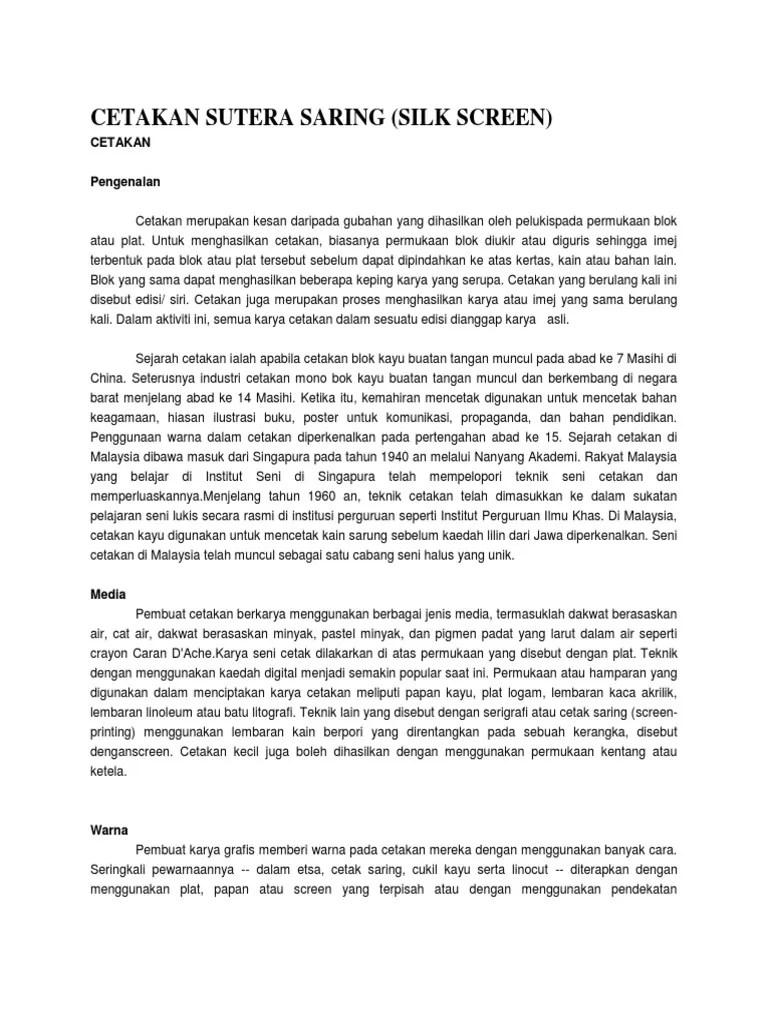 14.04.2020 · sekuji kaedah saring sutera (serigrafi) kaedah permukaan (planografi) kain sutera akan diregangkan di atas dihasilkan daripada permukaan seni cetakan kayu pemidang.